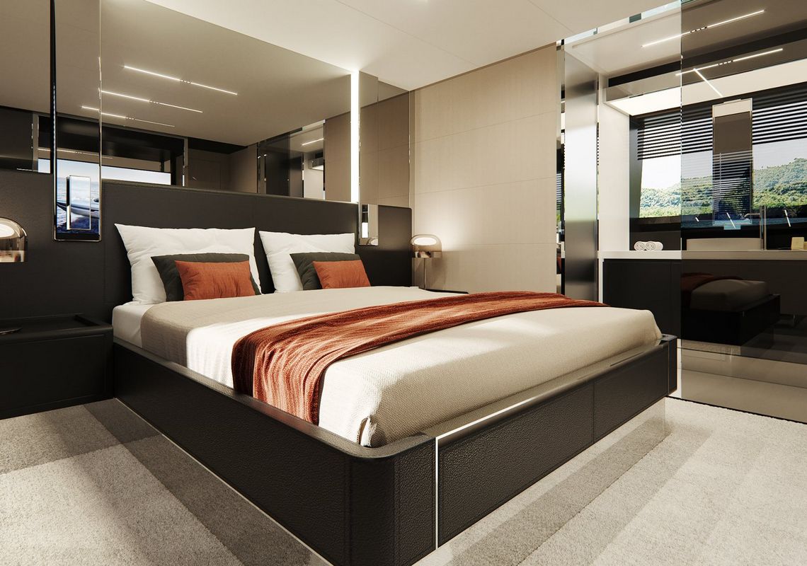 Neben dem hohen sportlichen Faktor der Riva 76 kommt der Komfort-Faktor nicht zu kurz: Die Flybridge mit großem Sonnendeck fügt sich harmonisch in die aerodynamischen Linien der Yacht ein und ermöglicht ein berauschendes Fahrgefühl. Eine großzügige Badeplattform, zu der zwei Treppen führen, und eine Garage für den 3,25 Meter langen Tender gehören zu den weiteren Vorzügen der Riva Perseo. Im Unterdeck garantieren drei Kabinen mit separaten Waschräumen einen angenehmen Aufenthalt. Eine weitere Kabine für den Skipper ist vorhanden. Sitzgruppen und Lounge-Areale im Cockpit, auf der Flybridge sowie auf Vorder- und Achterdeck ermöglichen ein geselliges Leben an Bord mit viel Variation für insgesamt 16 Personen.